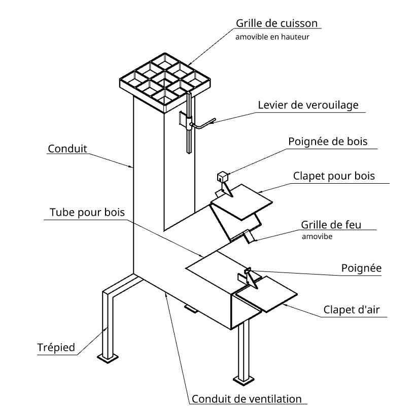Normalement la flamme sort par le haut du tuyau, ce qu’il faut pour chauffer une casserole ou une cafetière. Pour faire des grillades, la flamme ne doit pas toucher directement les aliments. En ouvrant le clapet du foyer, la flamme diminue tout en gardant la chaleur nécessaire à la grillade.
